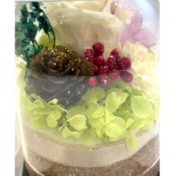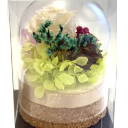 特徴的な丸いガラスドームは、内部に配置された花々を優しく包み込み、洗練されたエレガンスを引き立てます。一方、コルクの台座は、自然な風合いと温かみを加え、シンプルながらも高級感のあるデザインに仕上がっています。
