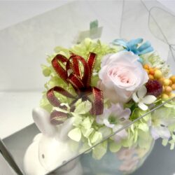 - プリザーブドフラワーとハイブリッドフラワーを融合した、長く楽しめるデザイン。