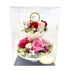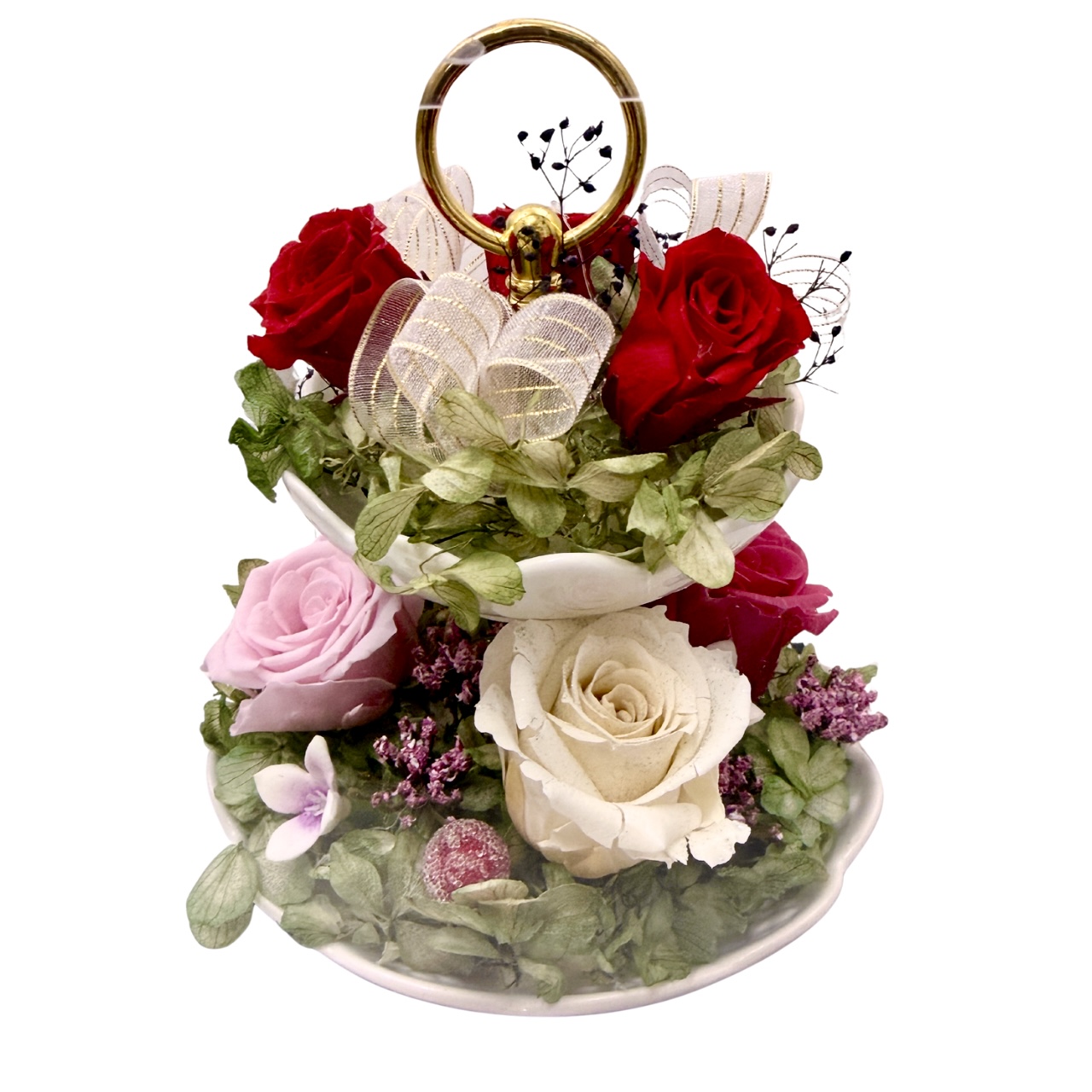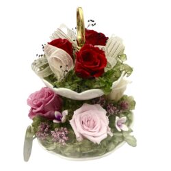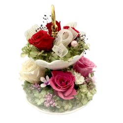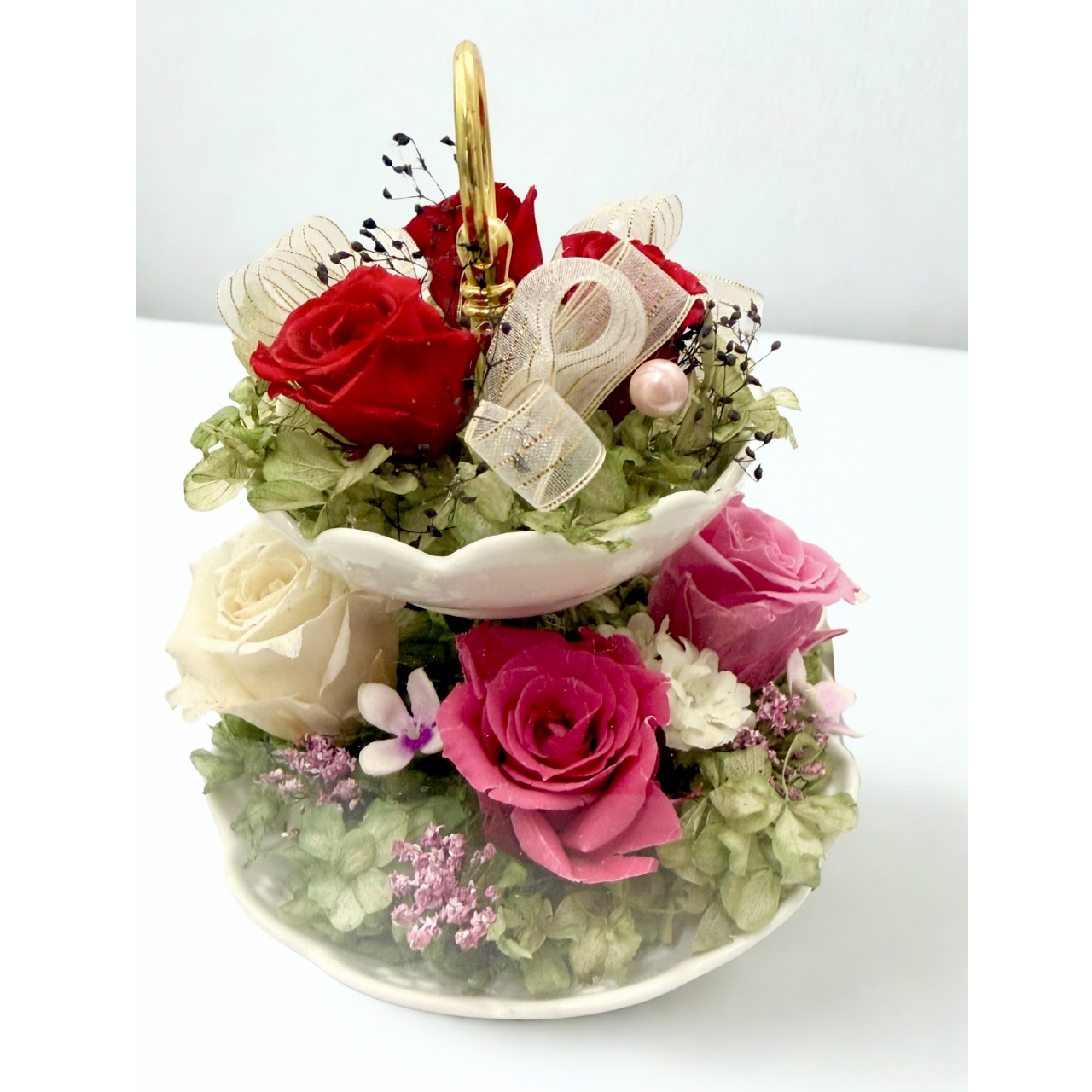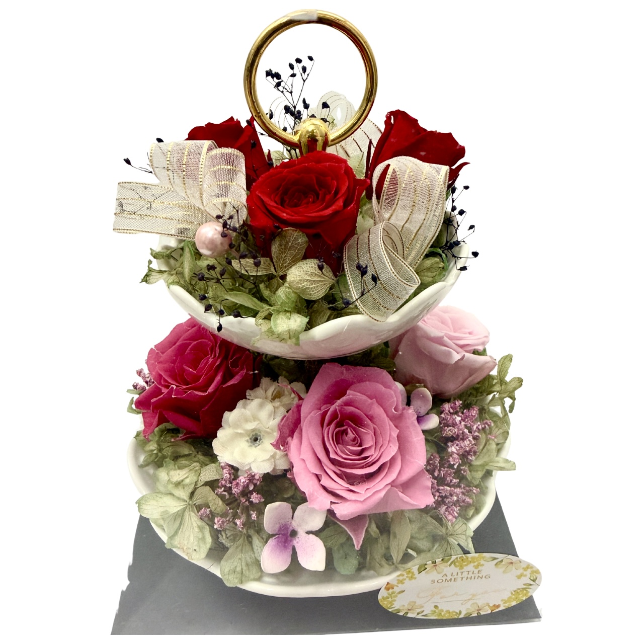 まるでスイーツスタンドのように、2段でお花を楽しめるプリザーブドフラワーギフト。レッド&ピンクの華やかさに、ホワイトローズの上品さを添えたアレンジで、飾るだけで空間がぱっと明るくなります。